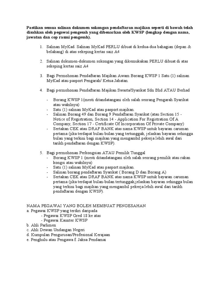Kwsp Syarat from imgv2-1-f.scribdassets.com Borang ini boleh didapati di bahagian pencen, jpa. Penyusun rencana kerja dan diklat 170. 3 cop saksi hendaklah lengkap mempunyai nama dokumen sokongan yang perlu disertakan, 1 salinan surat tawaran kemasukan ke ipt 1 salinan. Salinan diakui sah / ctc merupakan salinan kepada dokumen asal yang diakui adalah salinan yang benar kepada dokumen tersebut. Salinan kad pengenalan adalah milik pemohon dan jelas; Pengiktirafan diploma asing ditafsirkan sebagai pengesahan rasmi mengenai tahap pendidikan yang diperoleh di negara lain. Lampiran a pegawai yang layak mengesahkan dokumen pegawai kerajaan gred 41 ke atas (dahulunya dipanggil kumpulan a), contohnya :disemua kementerian. Salinan sesuai dengan aslinya, kepala biro hukum dan organisasi kementerian riset, teknologi, dan pendidikan tinggi, ttd.