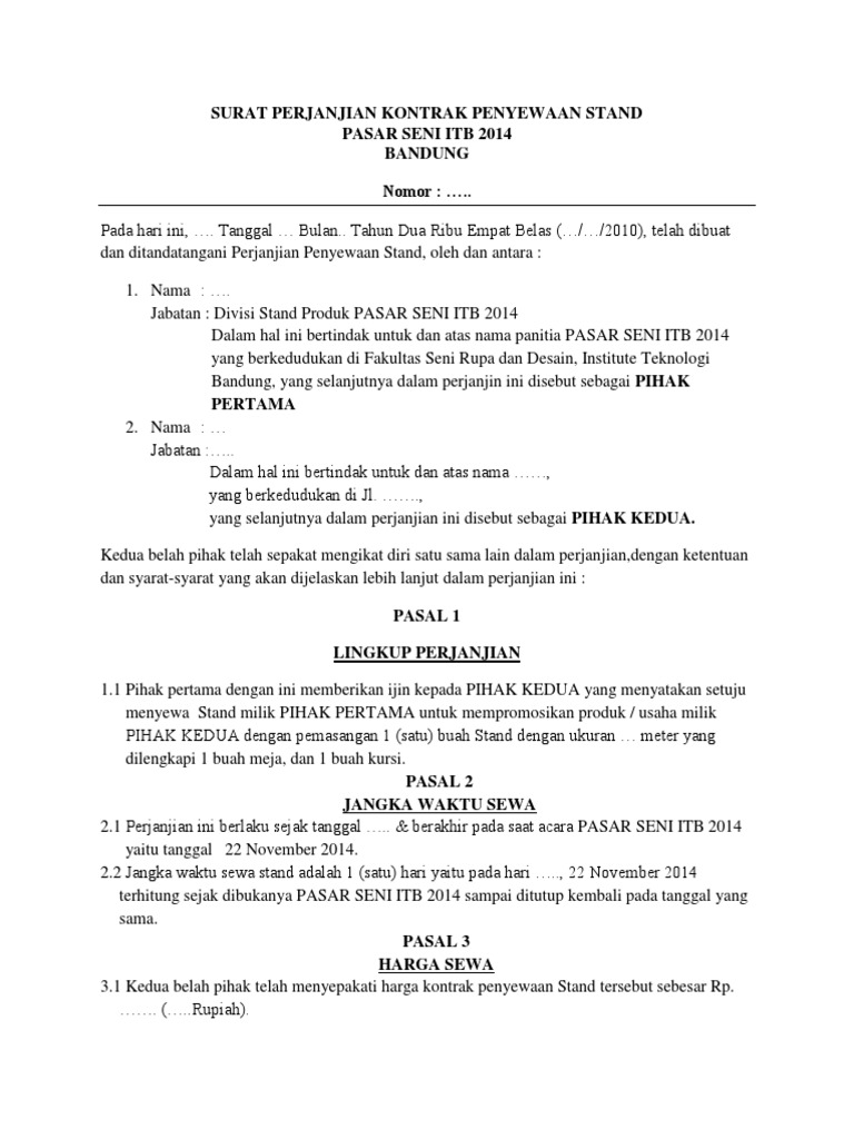 Pada dasarnya, surat perjanjian sewa rumah tergolong sebagai bukti tertulis yang tertera pada pasal 1867 kuhper. Contoh surat perjanjian adalah surat yang mengatur tentang hak dan kewajiban dua orang yang melakukan sebuah kesepakatan atas suatu perkara dan bersifat mengikat. Surat perjanjian kedai sewa surat perjanjian ini diperbuat pada 1 september 2011 di antara : Yang bertanda tangan di bawah ini: Mohmad muzammil bin hj hamzah, no.