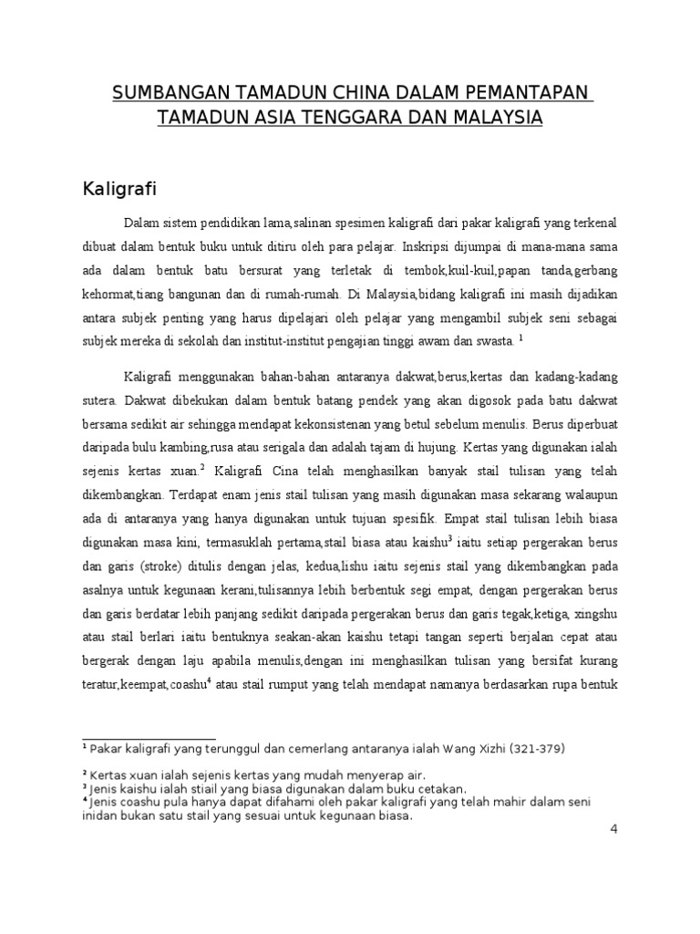 Nur aqila diana binti yusri. Malaysia merupakan dataran pertembungan tamadun utamatimur dan barat (kedudukan geografi).kesan : Makanan cina malaysia adalah sama dengan makanan di selatan china seperti yang terutama berasal dari makanan hokkien, kantonis, hakka dan teochew. Tamadun melayu, india dan cina sangat memberikan kesan yang kepada pelbagai aspek di malaysia. Sebagai kesannya, banyak pencampuran yang berlaku dalam kehidupan masyarakat seperti yang sudah berlaku. Tidak ramai cina malaysia adalah vegetarian, dan kebiasaannya penganut agama buddha yang taat. Berdasarkan pengajaran sesetengah agama, alam sekitar dilihat sebagai tmgerah tuhan. Teknik membuat kertas pencetakan bahan letupan kompas 50 5.9tamadun cina dan relevansinya di malaysia interaksi antara china dengan asia barat dan eropah agak lembap, berbanding interaksinya dengan asia timur. Selain itu, yang ditekankan ialah mengenai ideal demokrasi (khasnya kematangan, kemuafakatan, komuniti sebagai tumpuan), keamanan dan keharmonian, keadilan dan dedikasi terhadap negara. Tamadun china merupakan tamadun yang terawal muncul di dunia selain tamadun mesir dan tamadun yunani. Muhd hazim bin muhd azhar. 49 empat ciptaan agung pencapaian teknologi cina purba yang paling berguna dari segi sumbangan terhadap tamadun dunia ialah: Atif adilah binti abdul rahman.